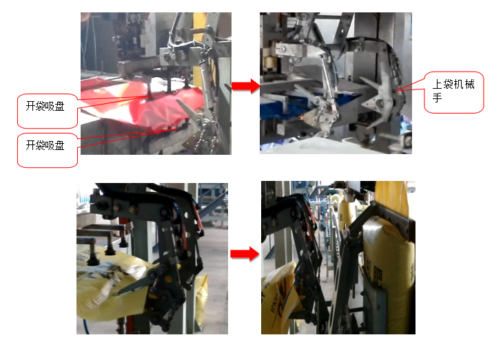 上袋裝置中開袋吸盤從包裝袋口上下兩個方向同時將包裝袋口吸開,上袋機械手伸入袋口內(nèi),將袋的上下兩面同時夾住,彎曲機械臂將包裝袋套到定量包裝秤下料口,過程結束。